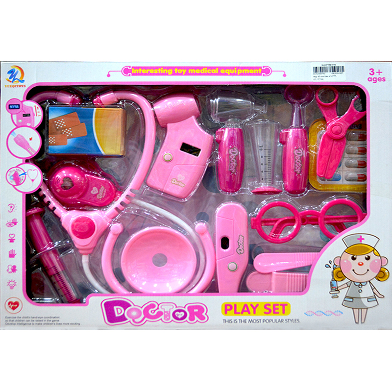 Gồm 17 món bao gồm các vật dụng của bác sỹ như: ống nghe, nhiệt kế, thuốc, xilanh... sẽ giúp cho bé phần nào làm quen và hiểu được công việc của một bác sĩ