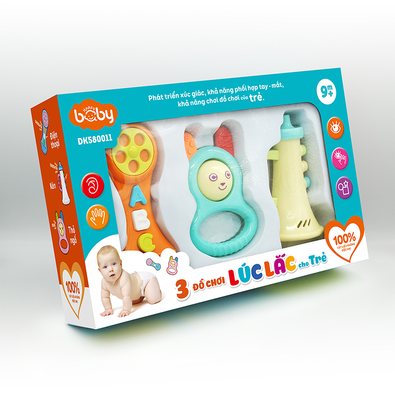 Hộp đồ chơi xúc xắc 3 món Duka DK580011 có hình dạng khác nhau: hình thỏ, điện thoại, kèn. Sản phẩm được làm làm từ chất liệu nhựa an toàn nên mẹ hoàn toàn yên tâm cho trẻ chơi. Xúc xắc tạo ra âm thanh chút chít kích thích thính giác của bé phát triển.