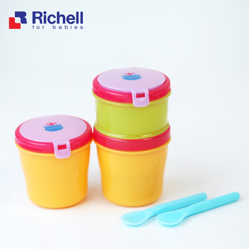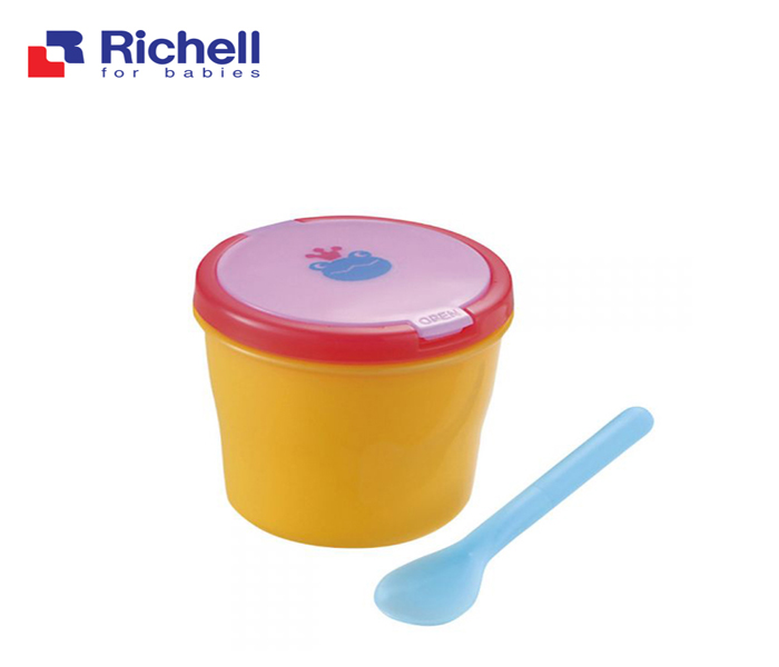 Hộp đựng đồ ăn nhỏ kèm thìa Richell để mẹ cho bé ăn và trữ đồ ăn trong tủ lạnh.