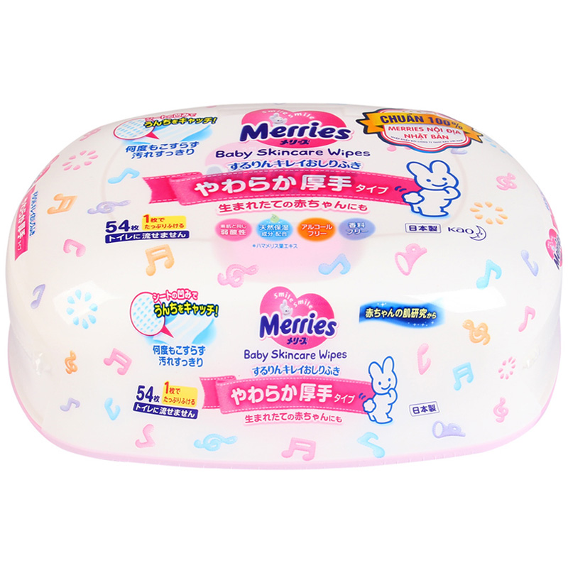 - Sản phẩm khăn ướt Merries không chứa cồn, không mùi hương, dịu nhẹ và an toàn với làn da của bé.