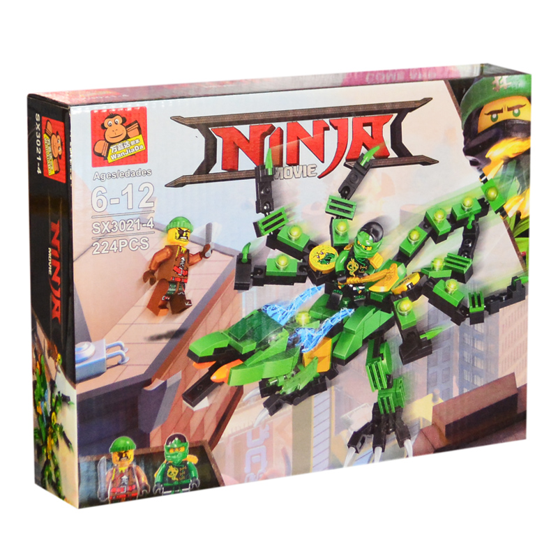 Hộp lắp ráp Ninja movie, Ninja không tặc xanh lá 224pcs SX.3021-4 với chủ đề không tặc tiêu diệt các phi cơ được điều khiển bởi những đối tượng hung ác góp phần đem lại sự bình yên cho cộng đồng. Bộ đồ chơi lắp ghép NInja được thiết kế nổi bật và bắt mắt với các góc cạnh được bo tròn không hề gây tổn hại cho bé khi chơi. Đây là đồ chơi hỗ trợ phát triển tư duy & tăng cường sự nhanh nhẹn cho đôi tay - phù hợp cho bé từ 6 tuổi trở lên