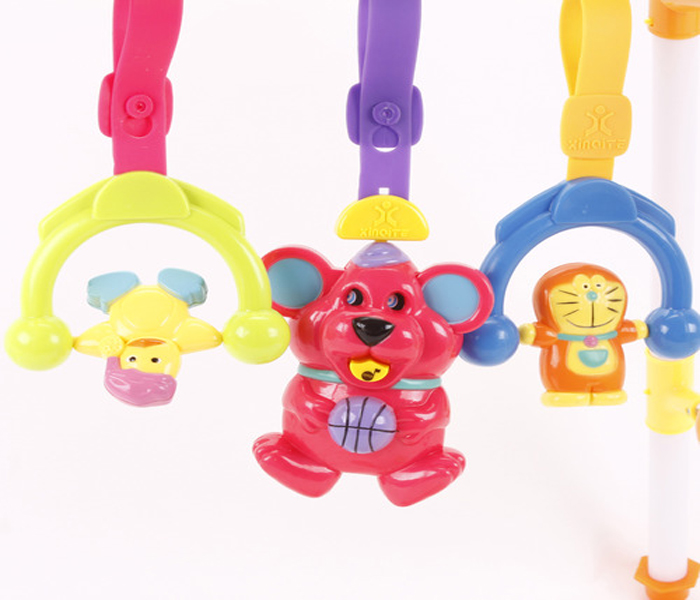 - Thanh ngang của kệ chữ A treo 3 món đồ chơi hoạt hình với thiết kế ngộ nghĩnh, màu sắc nổi bật, hấp dẫn bé khi nằm chơi, bao gồm: chú vịt vàng vui nhộn, chú chuột hồng ngậm bóng vui nhộn và mèo máy Doraemon tinh nghịch.