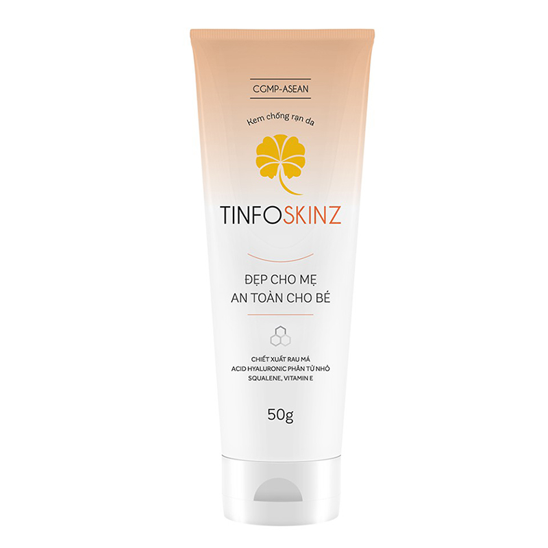 Kem chống rạn da Tinfoskinz (50g) với chiết xuất từ rau má, acid Hyaluronic phân tử nhỏ, Squalene và Vitamin E, an toàn với thai nhi, chống rạn da hiệu quả từ khi mang thai 3 tháng trở lên. Sản phẩm giúp đẹp da cho mẹ mà vẫn an toàn cho bé.