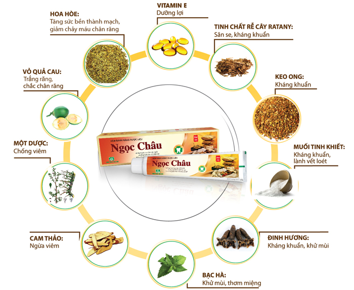 Kem đánh răng dược liệu Ngọc Châu (100g) bào chế từ các vị thuốc Đông Y, kết hợp muối và vitamin, không chỉ làm sạch răng lợi và an toàn mà còn giúp tăng cường máu lưu thông ở tủy răng và lợi, giúp nuôi dưỡng và bảo vệ răng lợi từ bên trong. Sản phẩm phù hợp cho mọi đối tượng, đặc biệt là những người bị nhiệt miệng, viêm lợi.