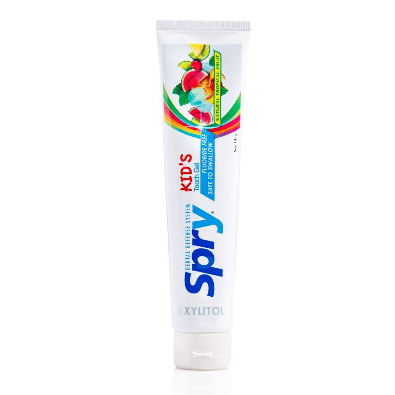 - Kem đánh răng trẻ em Spry Tropical Fruit không chứa Fluoride, an toàn nếu như lỡ nuốt phải. Trẻ em sẽ yêu thích hương vị trái cây nhiệt đới tự nhiên, giúp chúng dễ dàng thiết lập thói quen quan trọng.