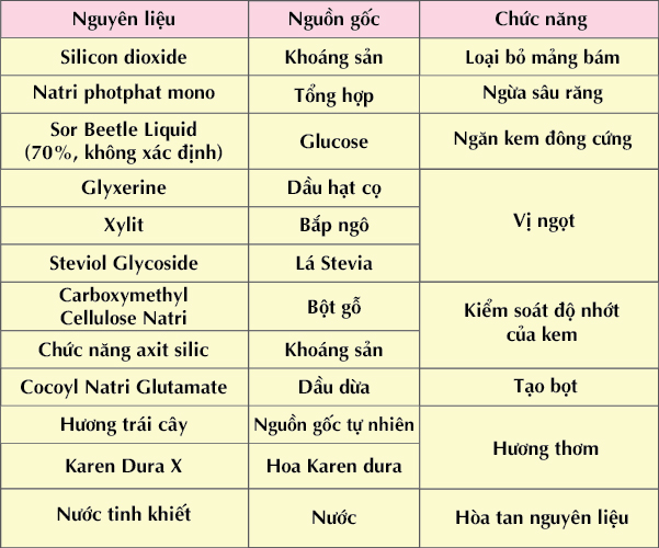 Chứa đến 99.65% thành phần có nguồn gốc tự nhiên, an toàn cho bé. Sản phẩm chỉ chứa 462 ppm Flouride, thấp hơn với tiêu chuẩn cho phép của quốc tế là 500 ppm nên rất độ an toàn, thậm chí bé có lỡ nuốt phải.