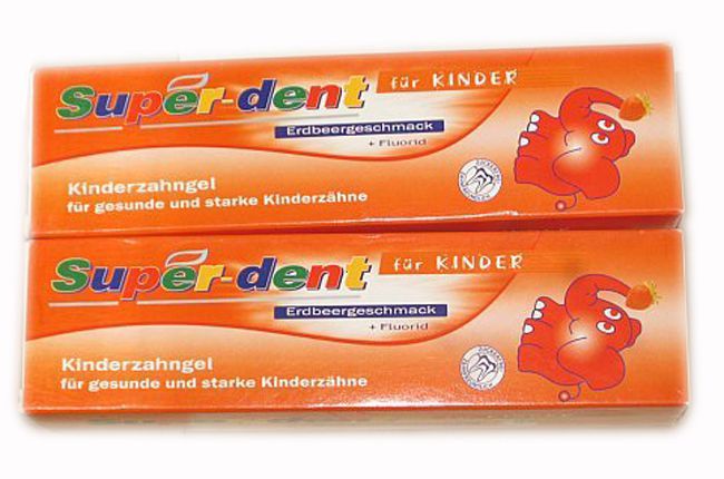 Kem đánh răng trẻ em Super -dent bổ sung Florua - ngăn ngừa sâu răng,Florua ức chế sự mất chất khoáng từ men răng và kích thích sự tái bổ sung khoáng chất(làm chắc các vùng răng đang bị yếu và có nguy cơ gây sâu răng).Florua cũng tác động đến những vi khuẩn gây sâu răng,ngăn sự tấn công của axit làm hư răng.Nguy cơ sâu răng có thể được hạn chế hơn nếu việc sử dụng Florua được kết hợp với chế độ dinh dưỡng lành mạnh và vệ sinh răng miệng tốt. Hương thơm tự nhiên trái dâu ngọt ngào kích thích cho bé có thói quen vệ sinh răng miệng hàng ngày.
