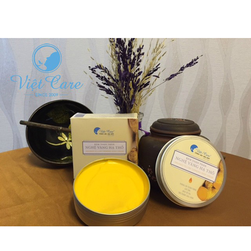 Theo dân gian từ lâu nghệ được dùng như một loại “mỹ phẩm” không thể thiếu đối với các bà mẹ mới sinh. Kem toàn thân nghệ vàng hạ thổ Vietcare được làm từ nghệ vàng đã được hạ thổ, loại bỏ tính axit, trải qua nhiều công đoạn rất công phu, tỉ mỉ, giúp thu nhỏ lỗ chân lông, giữ ẩm, làm sáng da cho phụ nữ sau sinh. Sản phẩm dạng kem, dễ sử dụng, loại bỏ những vùng da sạm, thâm nám.