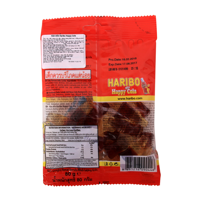 - Kẹo dẻo Haribo Happy Cola có hình dáng mô phỏng chai Cola ngộ nghĩnh cùng hương vị Cola mát lạnh, đặc trưng được nhiều bé yêu thích, đảm bảo mang đến sự ngon miệng và thích thú cho bé mỗi lần thưởng thức.
