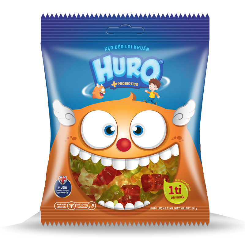 Kẹo dẻo lợi khuẩn Huro có bổ sung lợi khuẩn đầu tiên ở Việt Nam, rất tốt cho hệ tiêu hóa của trẻ nhỏ (>2 tuổi) cũng như người lớn. Sản phẩm được sản xuất theo công nghệ đến từ Anh Quốc chứa 1 tỷ lợi khuẩn HU58 trong mỗi viên kẹo, hơn nữa kẹo có hình thú dễ thương với đủ các hương vị trái cây như dâu, cam, nho, ổi, các vị trái cây nhiệt đới khác...sẽ kích thích các bé khi ăn.