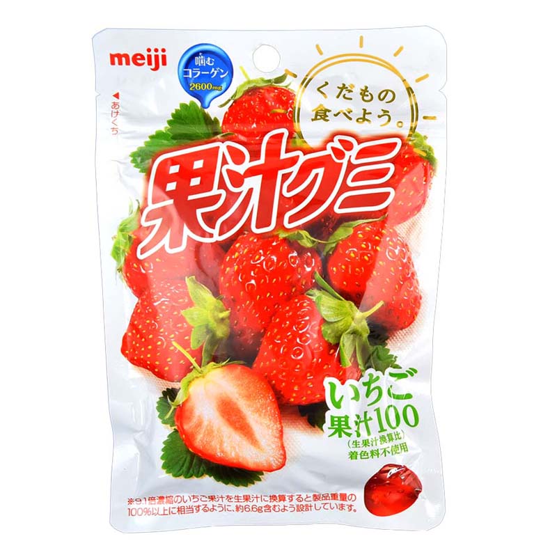 Kẹo dẻo Meiji vị dâu không sử dụng chất tạo màu, chiết xuất từ quả nho tươi thơm ngon, giúp bổ sung vitamin, giúp bé ăn ngon miệng. Kẹo dẻo mềm được nhiều bé yêu thích. Vị ngọt nhẹ từ nước ép nho được các bé đặc biệt yêu thích.