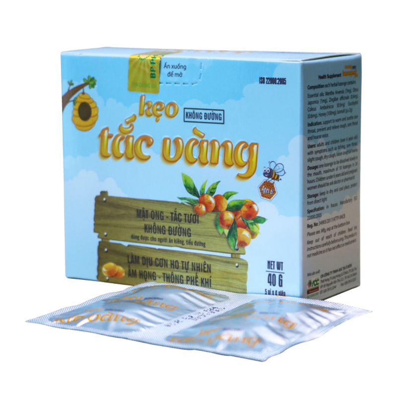 Kẹo tắc vàng được chiết xuất 100% từ thiên nhiên, không chất tạo màu hay bất cứ hóa chất độc hại nào khác. Đặc biệt, sản phẩm sử dụng đường isomalt dùng được cho người bệnh tiểu đường, người đang ăn kiêng và không gây sâu răng, hỗ trợ và cải thiện các triệu chứng cảm cúm, ho thông thường, ho do thay đổi thời tiết, đau rát họng, khàn tiếng, hỗ trợ làm ấm đường hô hấp.