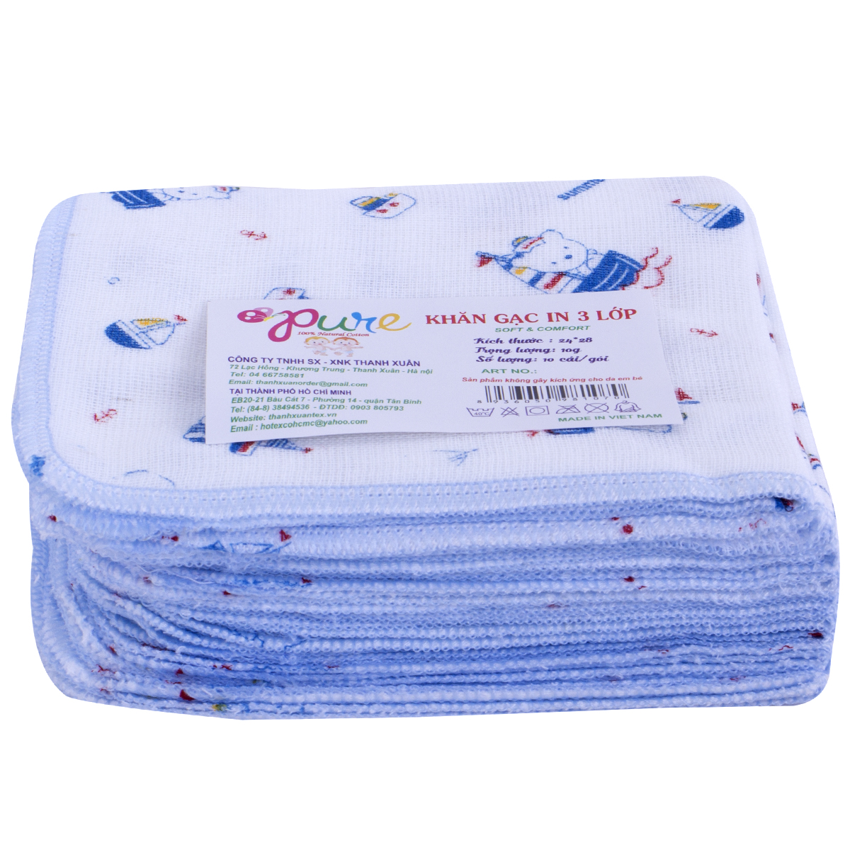 Khăn sữa Pure Thanh Xuân 3 lớp (24x28cm) với chất liệu cotton thấm hút mồ hôi, nước khá tốt, rất an toàn cho làn da của bé. Các mẹ có thể dùng khăn sữa Pure 3 lớp (24x28cm) để tắm hay lau mồ hôi cho bé mà không sợ, da bé sẽ bị trầy xước....Làn da trẻ sơ sinh vô cùng nhạy cảm, vì thế khi lựa chọn quần áo, tất hay bất kì sản phẩm nào tiếp xúc trực tiếp với da bé các mẹ cũng cần lựa chọn thật kĩ lưỡng để tránh gây tổn thương làn da mỏng manh cũng như sức khỏe của bé nhé.