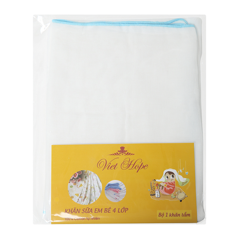 Với 100% sợi cotton tự nhiên, khăn tắm 4 lớp Viet Hope (75*80cm) có thiết kế đa năng, tiện dụng dành cho các bé từ sơ sinh trở lên. Sản phẩm đạt tiêu chuẩn chất lượng do Viện Dệt May chứng nhận nên bạn có thể yên tâm dùng khăn để thấm sữa, lau mặt, tắm cho em bé hay dùng cho cả gia đình.
