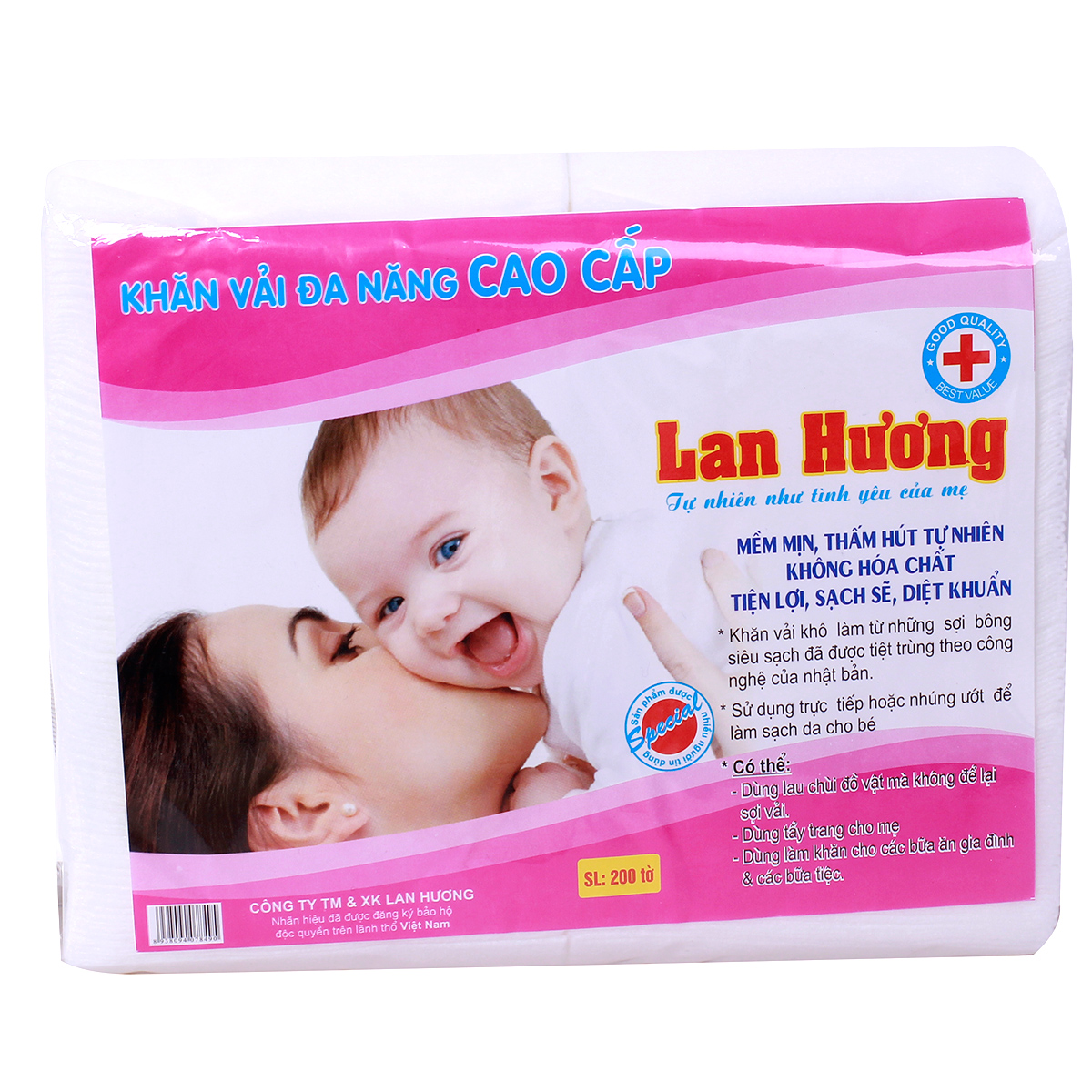 Khăn vải khô Lan Hương làm từ những sợi bông siêu sạch đã được tiệt trùng theo công nghệ Nhật Bản. Khăn có thiết kế mềm mịn, thấm hút tự nhiên, không hóa chất, tiện lợi, sạch sẽ, diệt khuẩn. Mẹ có thể sử dụng trực tiếp hoặc nhúng ướt để làm sạch da cho bé.