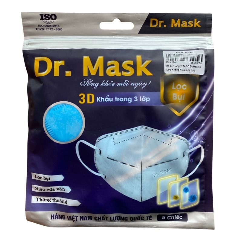 Khẩu trang y tế 3D 3 lớp kháng khuẩn Dr. Mask túi 5 cái an toàn giúp bảo vệ khỏi bụi bẩn, ô nhiễm và vi khuẩn gây hại. Sản phẩm được làm từ nguyên liệu nhập khẩu cao cấp, không mùi, thông thoáng tạo cảm giác dễ chịu cho người sử dụng.