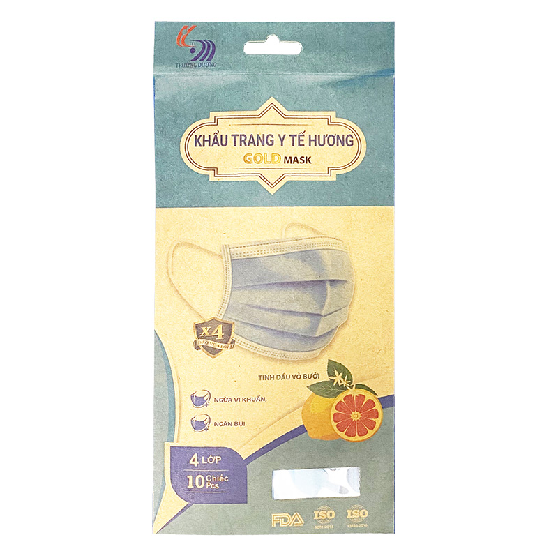 Khẩu trang y tế 4 lớp cao cấp Gold Mask Trường Dương hương tinh dầu vỏ bưởi (10c/túi) với sự kết hợp độc đáo và duy nhất giữa khẩu trang y tế 4 lớp với hương tinh dầu thiên nhiên kháng khuẩn. Sản phẩm giúp nhân đôi tác dụng bảo vệ, ngăn chặn virus và giúp khử mùi, mang lại cảm giác thoải mái khi đeo khẩu trang.
