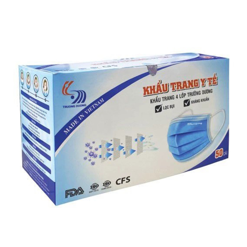 Khẩu trang y tế 4 lớp kháng khuẩn Trường Dương (50c/hộp) với 4 lớp bảo vệ, kháng khuẩn toàn diện, bảo vệ tối đa với lớp vải kháng khuẩn Meltblown giúp ngăn chặn trên 99% các hạt bụi mịn, khói, vi khuẩn và virus xâm nhập đường hô hấp.