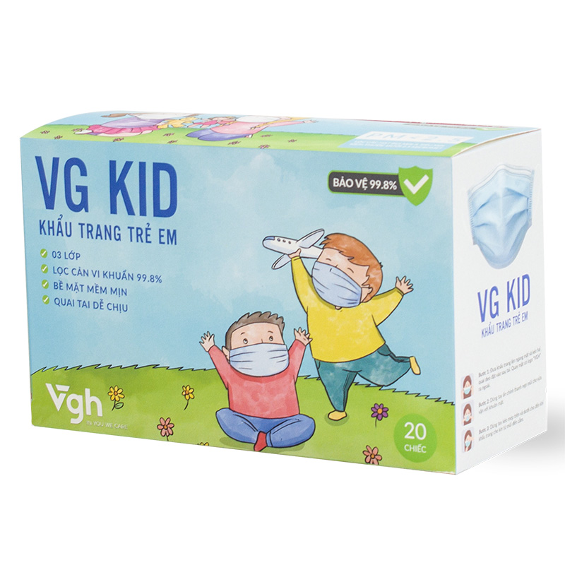 Khẩu trang y tế cho bé 3 lớp VG KID (20c/hộp) cấu tạo từ 3 lớp vải không dệt nguyên sinh với các chức năng riêng biệt của mỗi lớp mang đến lá chắn toàn diện, bảo vệ đường hô hấp khỏi những tác nhân gây hại cho sức khỏe như: khói bụi, vi khuẩn, virus... Lớp trong cùng sử dụng vải Polypropylene SSS định lượng 20 gsm mềm mại thoáng khí, có khả năng thấm nước. Thiết kế tối ưu với quai đeo mềm mại và nẹp mũi định hình 01 lõi kim loại chắc chắn mang đến cảm giác dễ chịu & thoải mái cho cho trẻ em khi sử dụng.