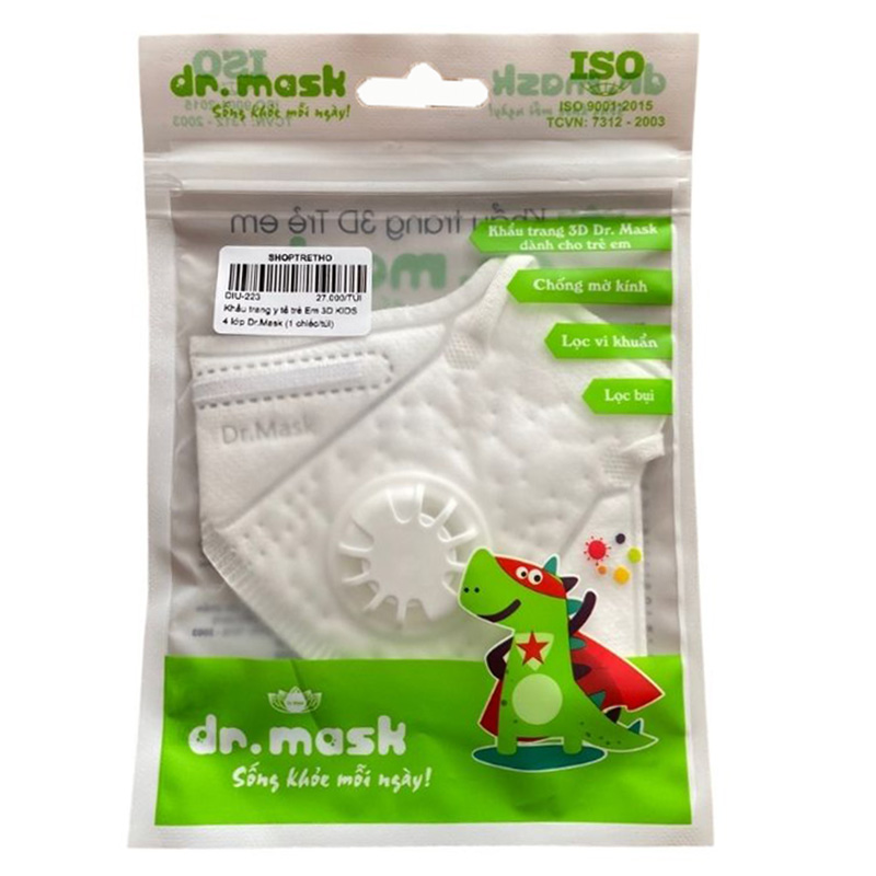 Khẩu trang y tế trẻ em 3D KIDS 4 lớp Dr. Mask với cấu tạo 4 lớp nguyên liệu nhập khẩu cao cấp, giúp ngăn ngừa khói bụi, vi rút, nấm mốc hiệu quả. Khẩu trang Dr. Mask có nhiều tính năng vượt trội như có thanh nẹp mũi, dây đeo chắc chắn mà không gây đau tai, dính miệng, giúp bé yêu thoải mái, dễ chịu khi sử dụng. Ngoài ra còn kết hợp 1 van thở, mang tới ưu điểm cực thông thoáng.