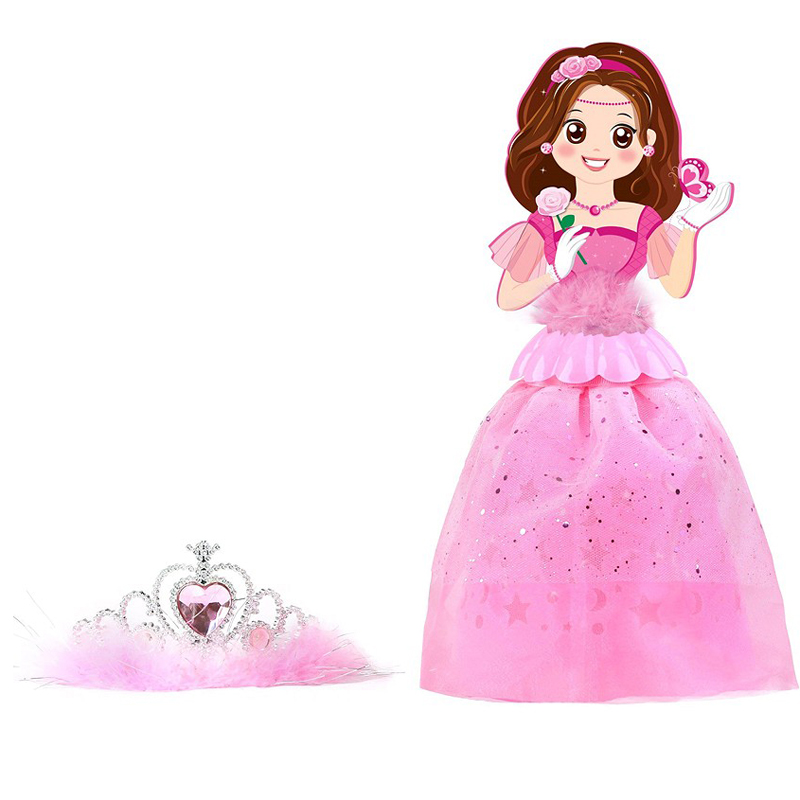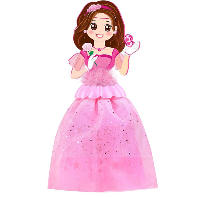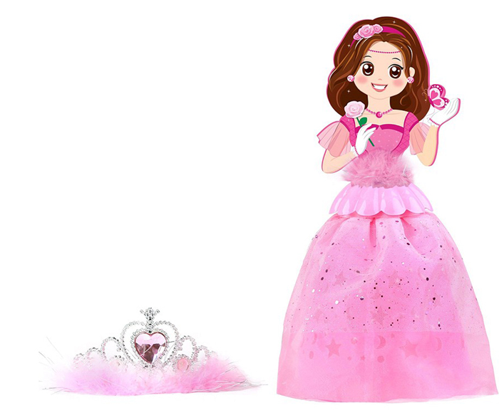 Thân công chúa: Chất liệu nhựa APS, màu hồng nhạt, được in chuyển nhiệt 2 mặt, đi kèm lông vũ cùng hạt cườm trang trí