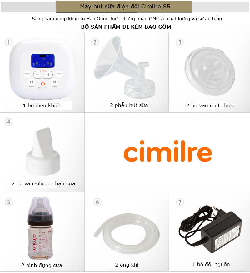 02 phễu chụp vú + 02 bình đựng sữa cao cấp (gồm bình sữa, núm ti, cổ bình, nắp đậy) + 1 động cơ chính + 02 bộ chống chảy ngược gồm màng silicon và nắp chụp + 02 van silicon màu trắng + 02 ống dây khí dài + 01 adapter + 1 phiếu bảo hành.