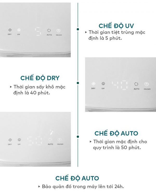 - Chế độ bảo quản tự động (Storage): Hoạt động trong 24 giờ, sau khi các chức năng chính cài đặt trước đó kết thúc. Cứ mỗi 2 giờ máy tự động tiệt trùng tia UV trong 1p.