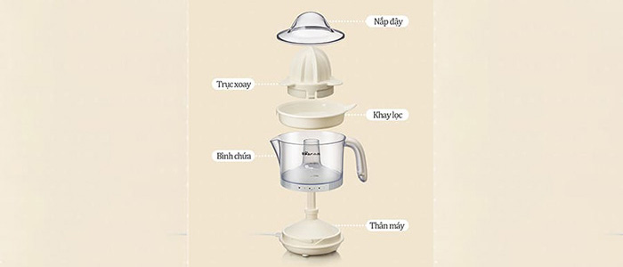 - Đi kèm với máy còn có nắp chống bụi và tay cầm tiện lợi hơn khi sử dụng, thân máy trong suốt có vạch định mức giúp bạn dễ dàng kiểm soát lượng nước cam cần sử dụng mỗi ngày.