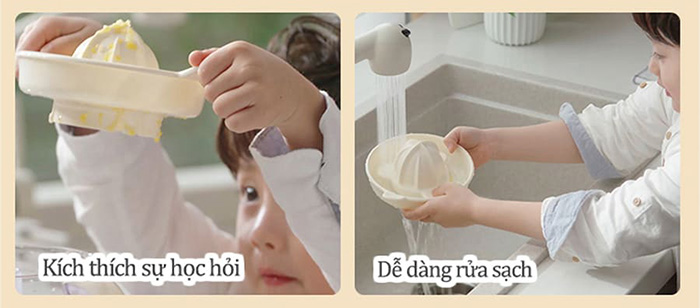 - Máy sở hữu cấu tạo đơn giản, thiết kế thông minh đảm bảo không rò rỉ điện nên bạn có thể hoàn toàn cho bé yêu thực hành vắt cam mỗi ngày, giúp bé mở mang kiến thức và tự chăm sóc mình tốt hơn.