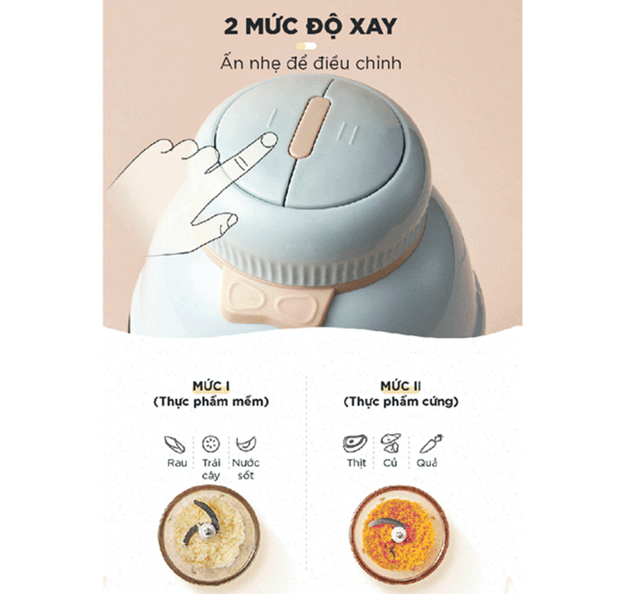 - Máy xay ăn dặm Bear có phương thức hoạt động rất đơn giản, chỉ cần nhấn nút để điều khiển. Có 2 mức xay khác nhau: