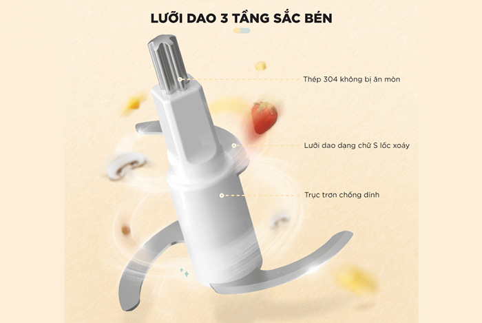 - Để tăng hiệu quả xay, lưỡi dao được làm bằng inox 304 bền chắc, không gỉ được thiết kế 3 tầng giúp xay cắt mạnh đều và nhuyễn mịn.