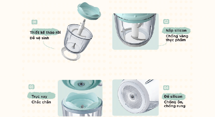 - Ngoài ra, máy xay luôn được thiết kế thêm tấm đệm silicon dưới đáy cối, giúp giảm tiếng ồn, xay êm ái hơn.
