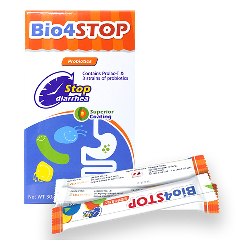 Men vi sinh Bio4STOP (30 gói/hộp) là thực phẩm bảo vệ sức khỏe giúp ổn định tiêu hóa và tăng khả năng hấp thu dưỡng chất, cho hệ tiêu hóa khỏe mạnh. Bổ sung lợi khuẩn giúp cân bằng hệ vi sinh đường ruột, giúp phòng ngừa và giảm các triệu chứng rối loạn tiêu hóa do loạn khuẩn đường ruột như: Tiêu chảy, táo bón, đi ngoài, phân sống sau vài giờ sử dụng.