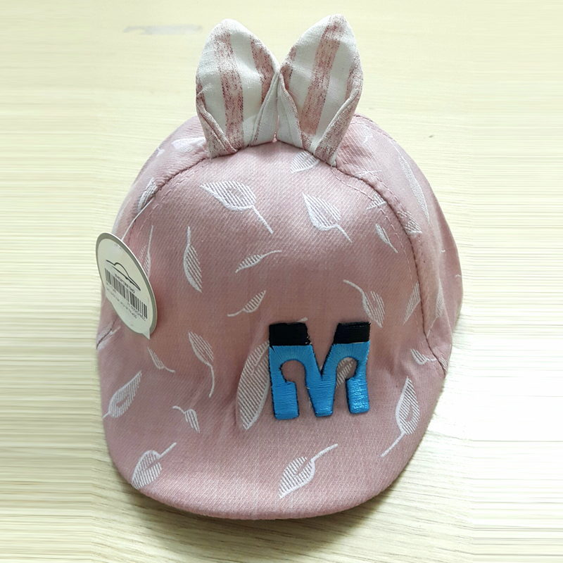 - Mũ có gam màu hồng nhạt, 2 tai thỏ phía trên dễ thương, họa tiết chữ M được thêu trước mũ