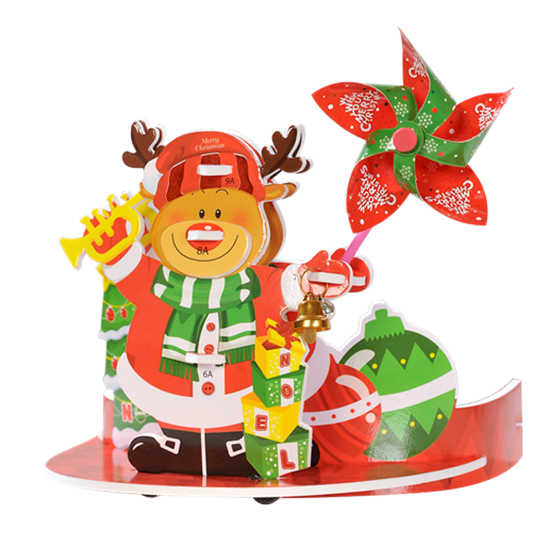 Nón 3D chong chóng Giáng Sinh Kibu - Tuần Lộc đứng với hình ảnh chú tuần lộc bên hàng loạt những hộp quà nhỏ xinh, tay cầm kèn thổi vui nhộn sẽ thu hút bé chơi cùng. Nón có chuông leng keng vui tai và chong chóng quay được khi di chuyển tạo sự thích thú cho bé khi chơi.