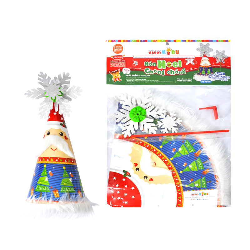 Nón Noel chong chóng - Ông Noel hạnh phúc được thiết kế để bé lắp ráp thành mũ chóp chong chóng rồi đội lên đầu để đi chơi Giáng Sinh hoặc tham gia các bữa tiệc. Sản phẩm không chỉ giúp bé yêu thật nổi bật trong đêm hội mà thông qua cách lắp ráp, bé phát triển trí não, khả năng linh hoạt tay chân.