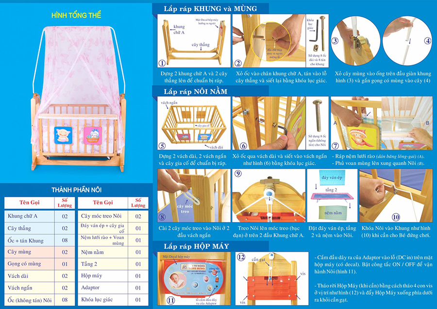 Hộp máy đưa mạnh mẽ mà nhịp nhàng, đều êm , giúp bé ngủ ngon, say, không bị giật mình thức giấc.