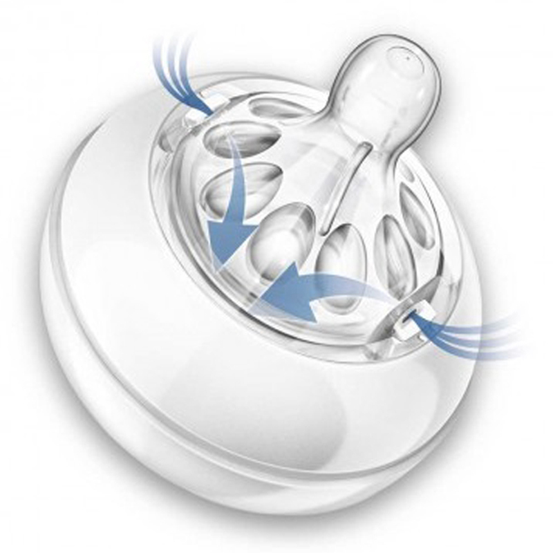 Hệ thống chống đầy hơi hai bộ phận độc đáo bao gồm đầu ty và vòng nối tiếp. Khi con bạn bú, vòng bao độc đáo trên đầu ty gập lại để cho không khí vào trong bình sữa thay vì vào bụng của con bạn.