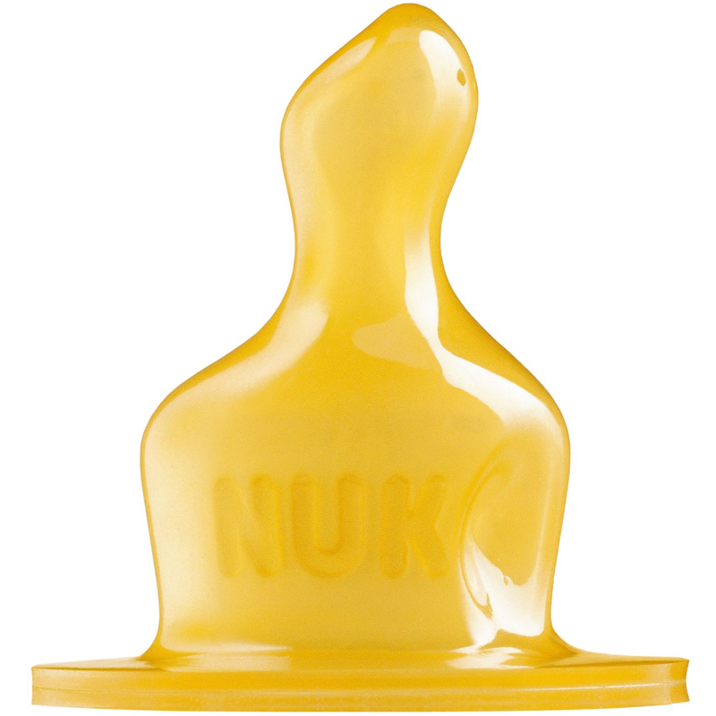 - Vị trí lỗ tiết sữa của NUK nằm ở bề mặt trên làm cho tia sữa không đi thẳng vào họng giúp bé tránh bị sặc khi bú, đường cong trên thân núm vú được thiết kế phù hợp với cử động gợn sóng của lưỡi.
