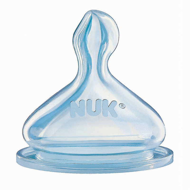 - Vị trí lỗ tiết sữa của Nuk nằm ở bề mặt trên làm cho tia sữa không đi thẳng vào họng giúp bé tránh bị sặc khi bú, đường cong trên thân núm vú được thiết kế phù hợp với cử động gợn sóng của lưỡi.