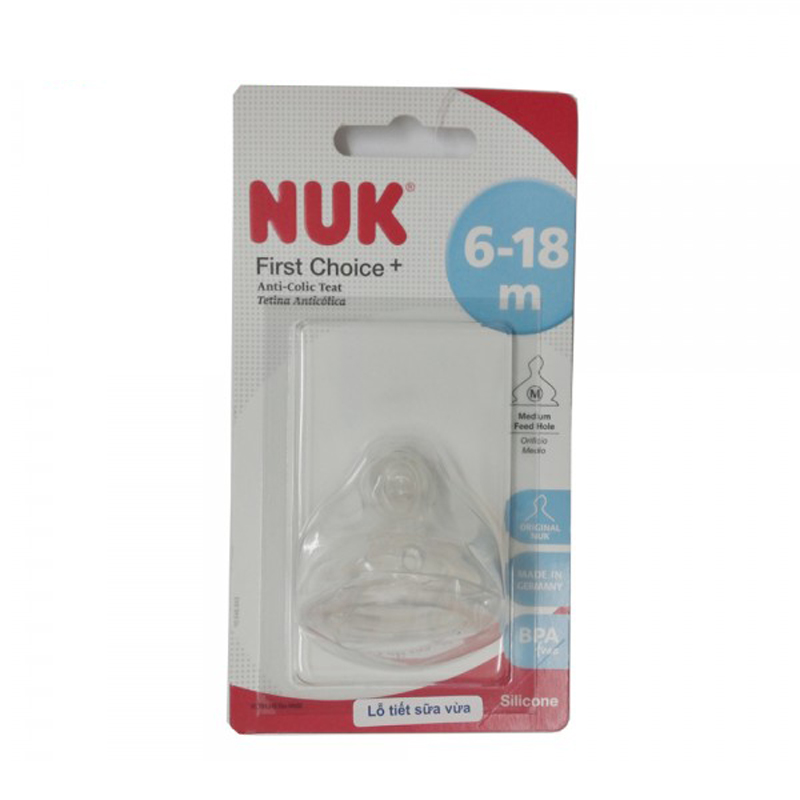 - Vị trí lỗ tiết sữa của Nuk nằm ở bề mặt trên làm cho tia sữa không đi thẳng vào họng giúp bé tránh bị sặc khi bú, đường cong trên thân núm vú được thiết kế phù hợp với cử động gợn sóng của lưỡi.