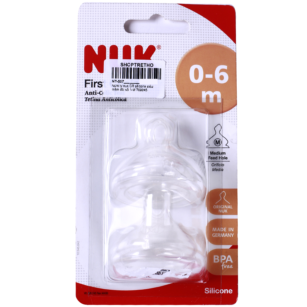 Núm ty Nuk CR silicone siêu mềm đôi số 1 dùng cho bình cổ rộng là sản phẩm thay thế cho ty mẹ rất tốt, giúp bé cảm nhận sự êm ái khi bú như luôn được ở bên mẹ yêu. Sản phẩm có thiết kế giống bầu ty mẹ với điểm tì môi rộng và mềm mại giúp quá trình chuyển đổi từ bú mẹ sang bú bình dễ dàng. Núm có thiết kế độc đáo giúp bé tránh bị sặc khi bú, đường cong trên thân núm vú được thiết kế phù hợp với cử động gợn sóng của lưỡi. Đặc biệt có van thông hơi giúp trẻ ổn định lượng sữa khi bú và tránh nuốt phải không khí gây đầy hơi khó chịu.