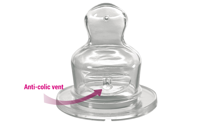 - Lỗ thông khí (anti-colic vent) giúp lưu thông không khí, điều chỉnh dòng chảy, giúp bé không nuốt phải không khí trong quá trình bú mẹ, hiệu quả trong việc ngăn ngừa các triệu chứng đầy hơi, khó tiêu, chống sặc và giảm thiểu nguy cơ đau bụng colic (đau bụng do đầy hơi) của bé sơ sinh.