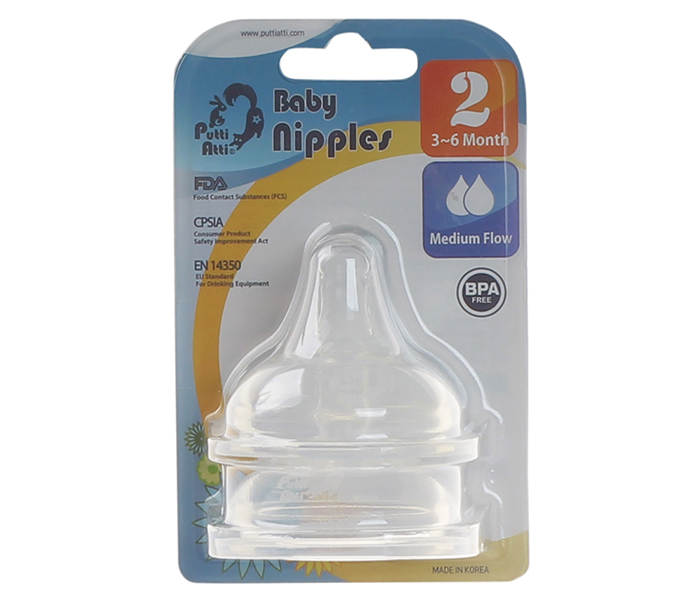 Núm ty silicone Putti Atti được thiết kế dành riêng cho bình sữa Putti Atti được làm hoàn toàn từ silicone lỏng, chất liệu vốn dùng trong y tế. Núm ty silicon siêu mềm, nhẹ nhàng với nướu lợi, nhờ thiết kế vòng gân bên trong trên đầu ty giúp tăng cường độ đàn hồi, ngăn chặn trường hợp bẹp dính làm gián đoạn dòng chảy sữa khi bé mút, từ đó cho bé ăn thật thoải mái và ngon miệng.