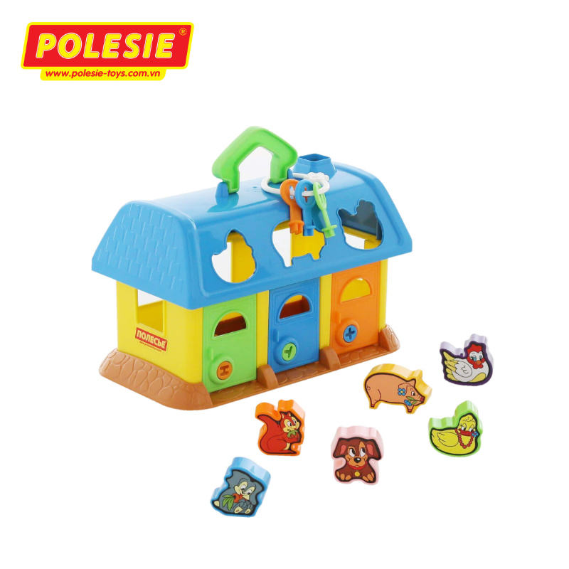 Bộ đồ chơi gồm có 6 ô thả hình: một con lợn, một con vịt, một con gà mái, một con sóc, một con thỏ, một con chó, một bộ chìa khóa mở cửa
