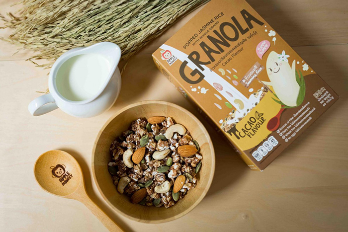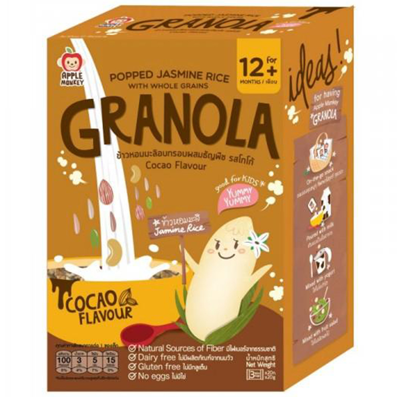 Ngũ cốc ăn sáng Apple Monkey vị Cacao Granola là ngũ cốc, ngũ cốc được trộn với trái cây khô như đu đủ khô, hạt bí đỏ, hạt hoa hướng dương, hạt mè, hạt ngũ cốc để tăng thêm chất xơ cho bé; không sữa bò, không trứng, không gluten.