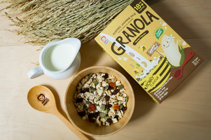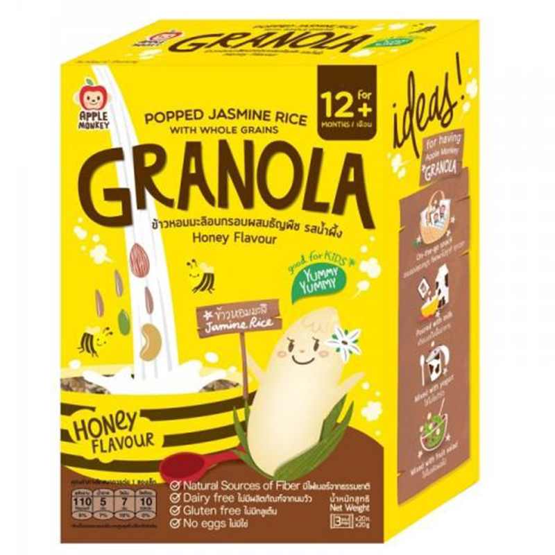 Ngũ cốc ăn sáng Apple Monkey vị mật ong Granola là ngũ cốc, ngũ cốc được trộn với trái cây khô như đu đủ khô, hạt bí đỏ, hạt hoa hướng dương, hạt mè, hạt ngũ cốc để tăng thêm chất xơ cho bé; không sữa bò, không trứng, không gluten.