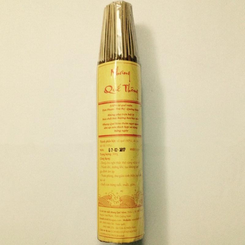 Hỗn hợp bột nhang bao gồm: 90% là vỏ quế và lá quế (trong đó vỏ quế là chủ yếu), 10% là vỏ cây bời lời.