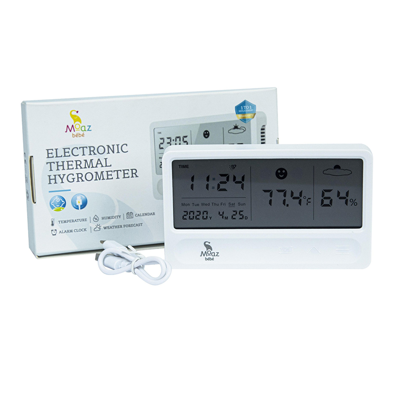 Nhiệt ẩm kế Moaz Bebe MB-016 với thiết kế đa năng không chỉ giúp bạn theo dõi độ ẩm, nhiệt độ trong phòng để chủ động phòng tránh các bệnh do thời tiết gây ra. Hơn nữa, sản phẩm còn có thể báo được lịch ngày tháng năm, báo thức, báo thời tiết...sử dụng pin sạc tiện lợi.