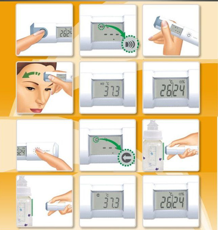 - Sản phẩm sử dụng tia hồng ngoại, tích hợp sensor cảm biến nhiệt với độ nhậy tuyệt đối, không cần tiếp xúc với vật cần đo nhiệt độ, chỉ cần để nhiệt kế cách vật cần đo nhiệt độ một khoảng nhất định, bấm nút đo, sau 3s có tín hiệu báo